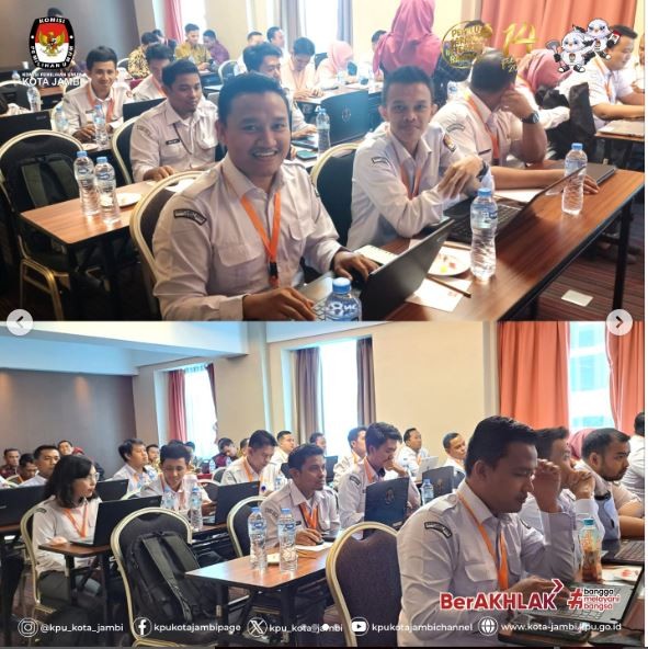 KPU Kota Jambi Divisi Perencanaan, Data dan Informasi H. Abdul Rahim, Anggota KPU Kota Jambi Divisi Teknis Penyelenggara Deni Rahmat, Operator Sidalih Qhoiru Rommy dan Operator Sirekap Muhammad Luthfi mengikuti Bimbingan Teknis Pemungutan, Penghitungan dan Rekapitulasi Hasil Penghitungan Perolehan Suara dan Penggunaan Sirekap dalam Pemilu Tahun 2024. bertempat di The Trans Luxury Hotel Bandung, Sabtu-Selasa (25-28/11/2023).