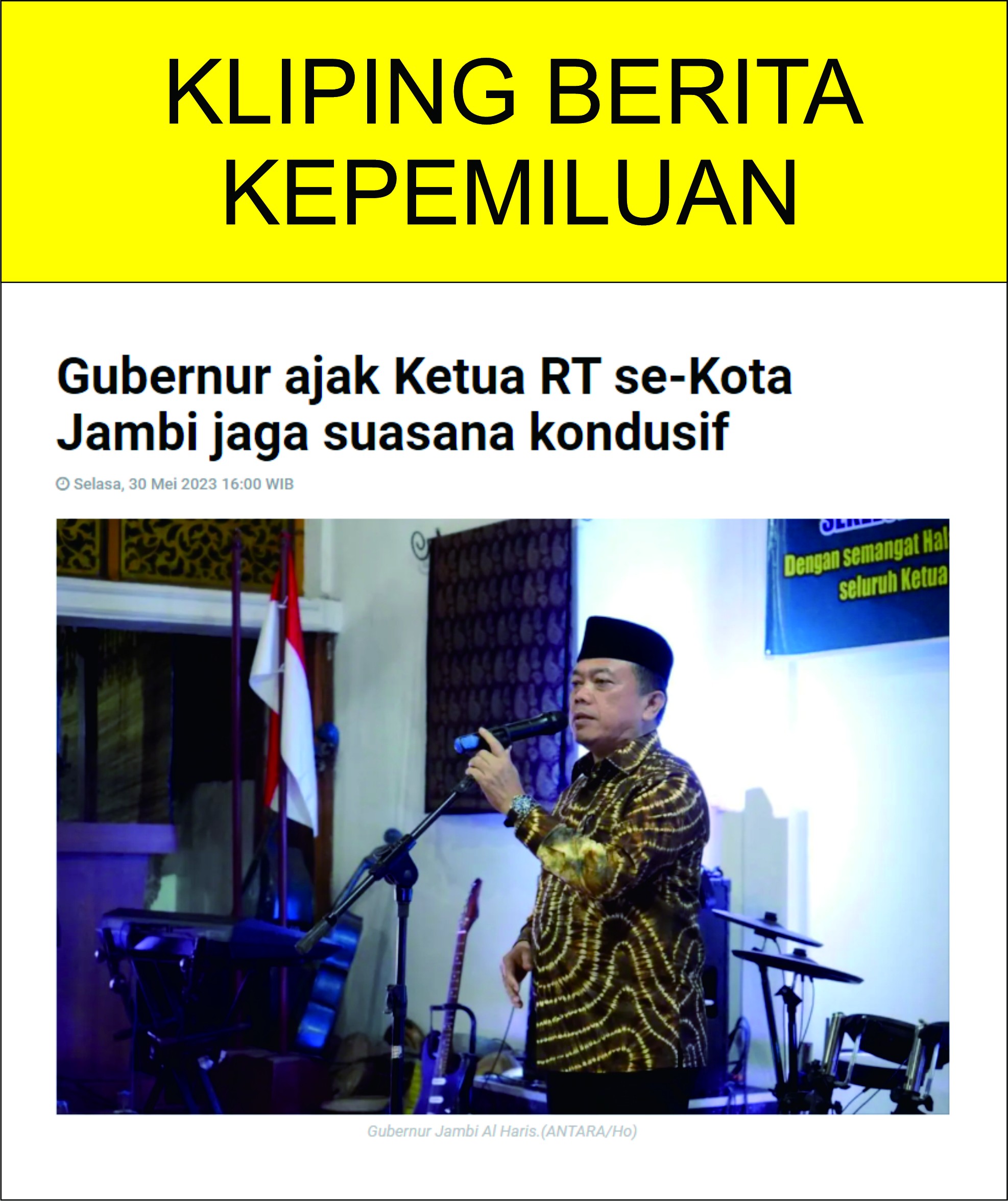 Gubernur ajak Ketua RT se-Kota Jambi jaga suasana kondusif Rabu, 30 Agustus 2023 07:00 781 (UNTUK MELIHAT BERITA DAPAT DI KLIK PADA GAMBAR) Bagikan: Telah dilihat 781 kali