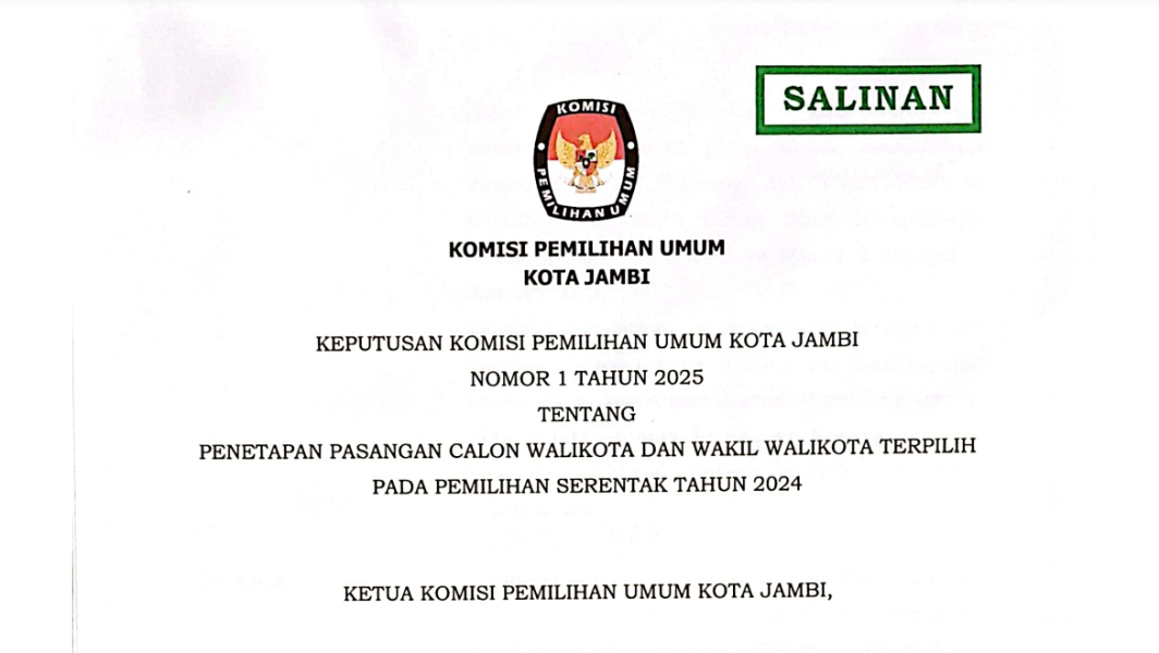 KEPUTUSAN KOMISI PEMILIHAN UMUM KOTA JAMBI NOMOR 1 TAHUN 2025 TENTANG PENETAPAN PASANGAN CALON WALIKOTA DAN WAKIL WALIKOTA TERPILIH PADA PEMILIHAN SERENTAK TAHUN 2024