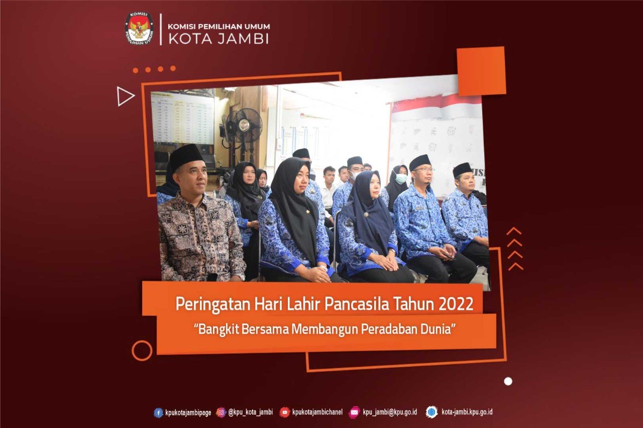 KPU Kota Jambi melaksanakan upacara memperingati hari lahirnya Pancasila pada tanggal 1 Juni 2022, bertempat di Aula Kantor KPU Kota Jambi yang diikuti oleh Pimpinan Komisioner ,Sekretaris, Kasubag ,Fungsional dan Staf Sekretariat KPU Kota Jambi.