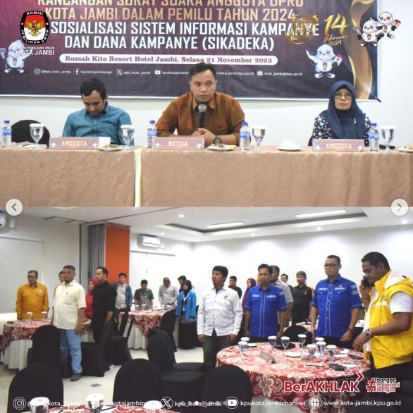 KPU Kota Jambi melaksanakan Penandatanganan Berita Acara Persetujuan Rancangan Surat Suara Anggota DPRD Kota Jambi dalam Pemilu 2024 dan Sosialisasi Sistem Informasi Kampanye dan Dana Kampanye (SIKADEKA), bertempat di Rumah Kito Resort Hotel Jambi, Selasa (21/11/23).