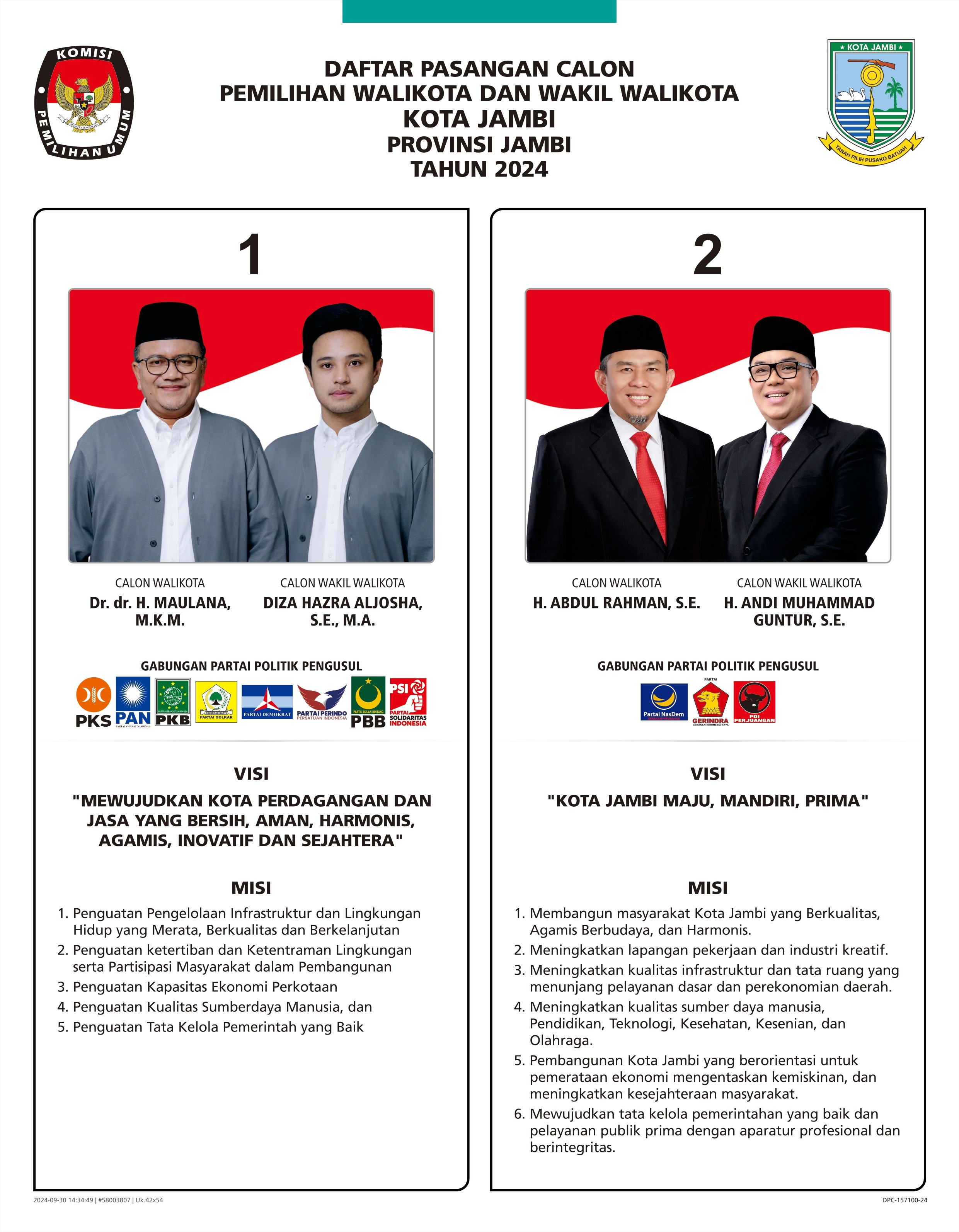 PENGUMUMAN | Daftar Pasangan Calon Walikota dan Wakil Walikota Jambi Tahun 2024