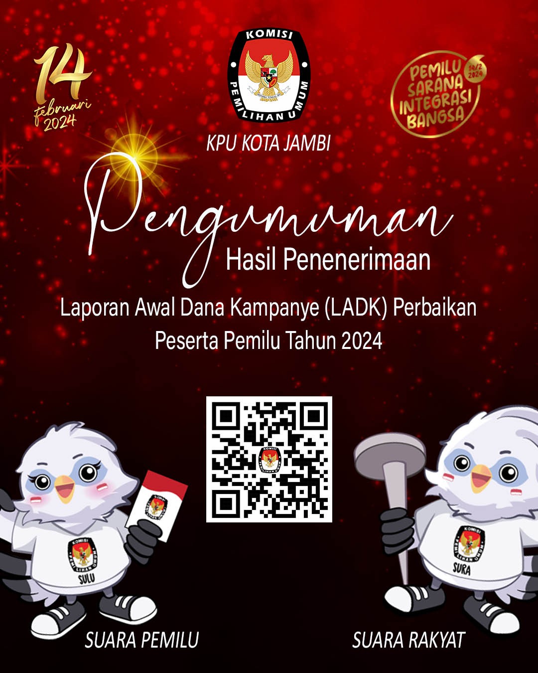 PENGUMUMAN HASIL PENERIMAAN LAPORAN AWAL DANA KAMPANYE (LADK) PERBAIKAN PESERTA PEMILU TAHUN 2024 TINGKAT KOTA JAMBI Sabtu, 13 Januari 2024 07:00 437 Berikut ini merupakan Hasil Penerimaan Laporan Awal Dana Kampanye (LADK) Perbaikan Peserta Pemilu Tahun 2024 tingkat Kota Jambi Bagikan: Telah dilihat 437 kali