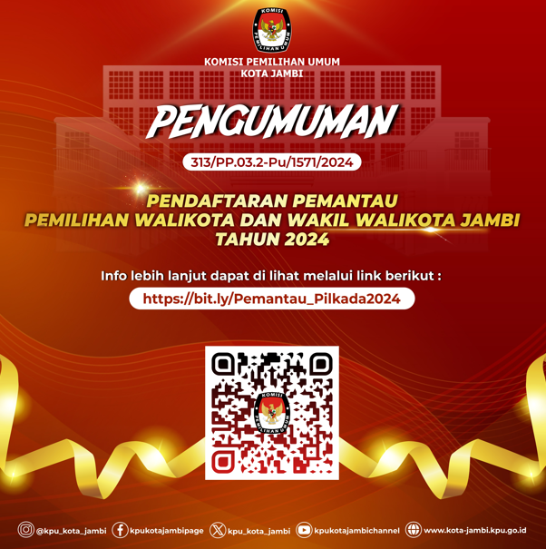 Dalam rangka melaksanakan Keputusan KPU Kota Jambi Nomor 329 Tahun 2024 tentang Pedoman Teknis Pelaksanaan Tahapan dan Jadwal Penyelenggaraan Pemilihan Walikota dan Wakil Walikota Jambi Tahun 2024 serta Keputusan KPU Kota Jambi Nomor 330 Tahun 2024 tentang Pedoman Teknis Pendaftaran Pemantau Pemilihan Walikota dan Wakil Walikota Jambi Tahun 2024, maka KPU Kota Jambi mengumumkan pendaftaran Pemantau Pemilihan Dalam Negeri Pemilihan Walikota dan Wakil Walikota Jambi Tahun 2024 harus memenuhi ketentuan sebagai berikut :