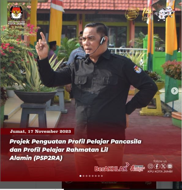 Anggota KPU Kota Jambi Divisi Perencanaan, Data, dan Informasi H. Abdul Rahim menjadi Narasumber dalam kegiatan Projek Penguatan Profil Pelajar Pancasila dan Profil Pelajar Rahmatan Lil Alamin (P5P2RA). Bertempat di MTs Negeri 2 Kota Jambi, pada hari Jumat (17/11/23).