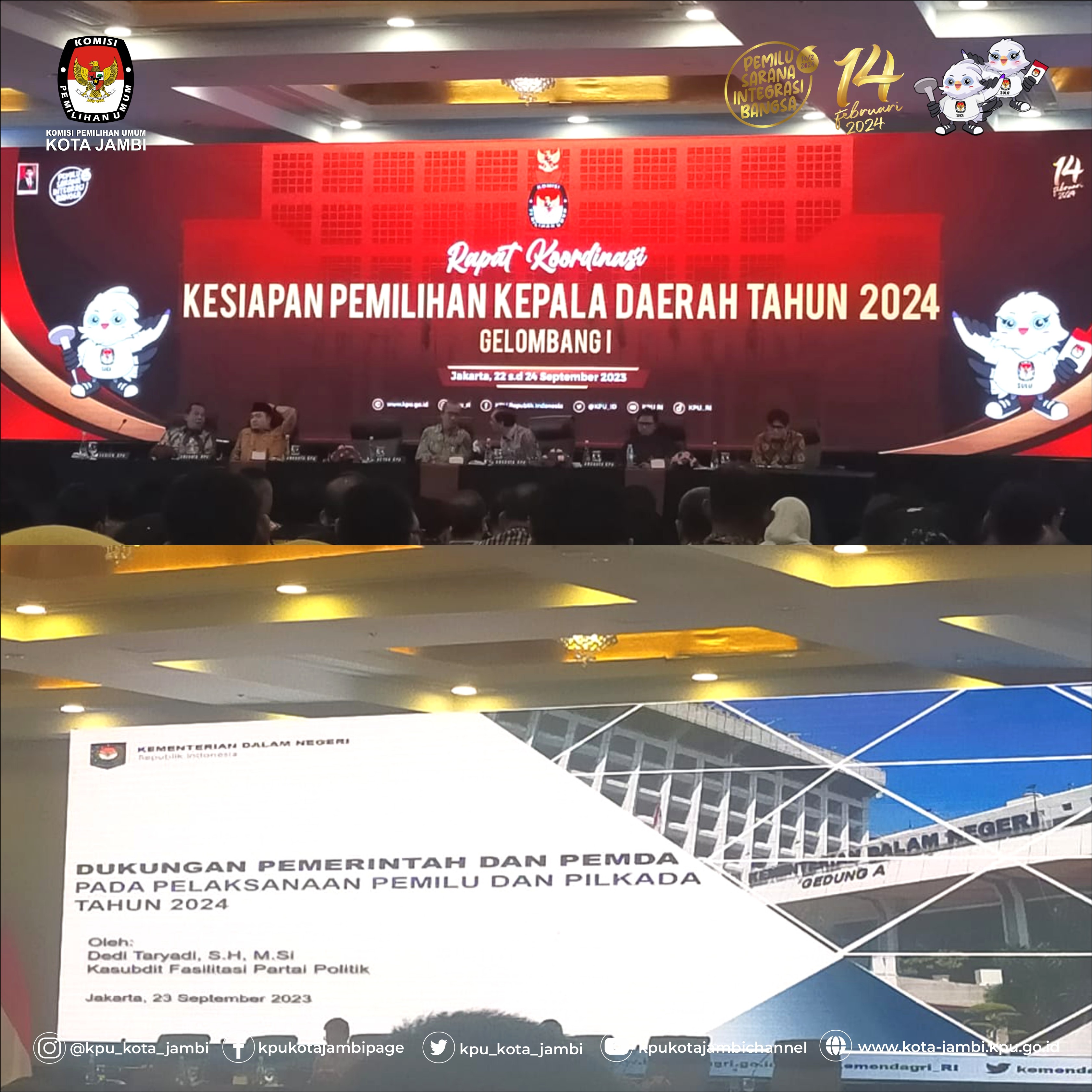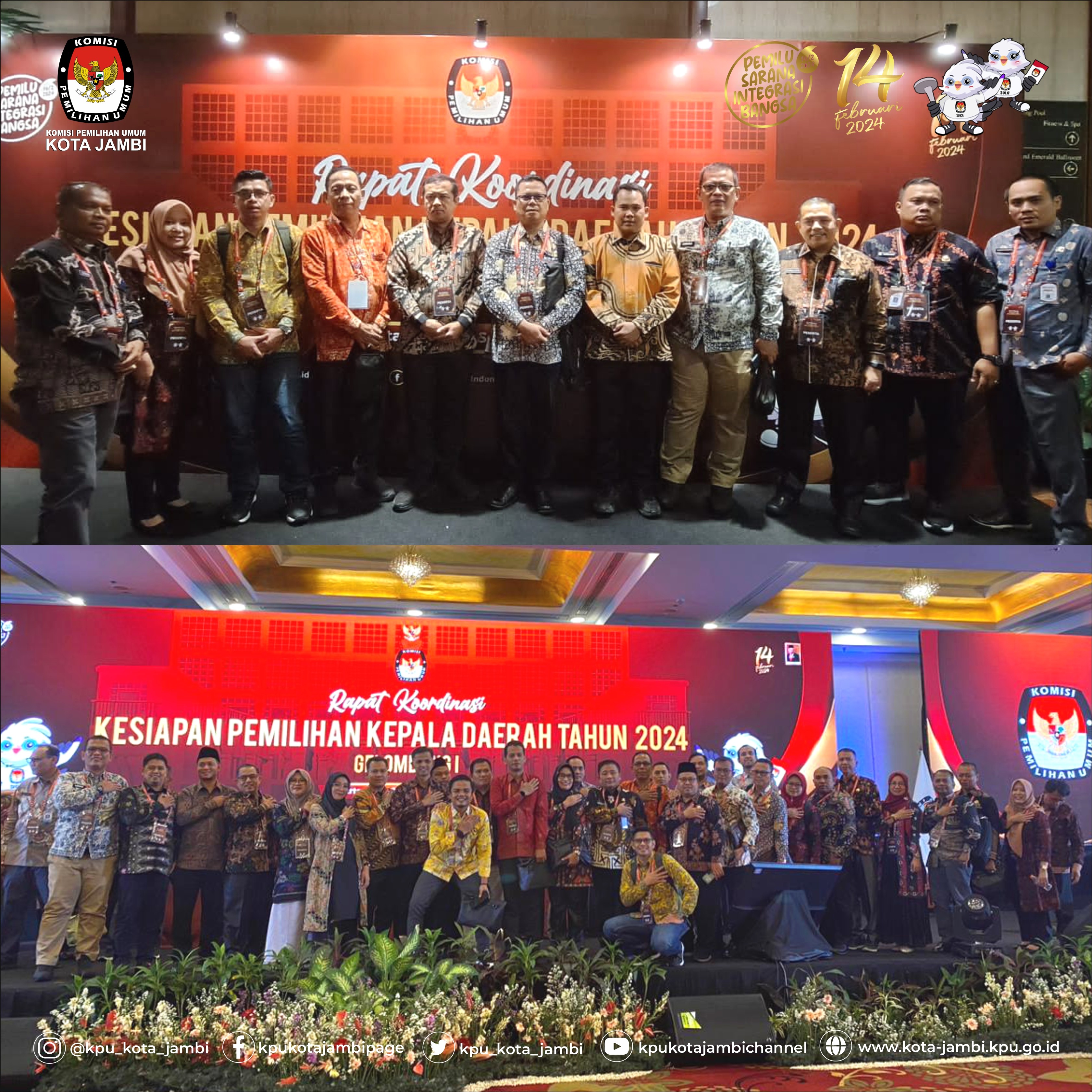 Ketua KPU Kota Jambi Arif Lesmana Yoga, Anggota KPU Kota Jambi Deni Rahmat, dan Sekretaris KPU Kota Jambi Dessy Nur Lisa Lumban Tobing mengikuti Rapat Koordinasi Kesiapan Pemilihan Kepala Daerah Tahun 2024 Gelombang I, Jakarta, Jumat-Minggu (22-24/9/23).
