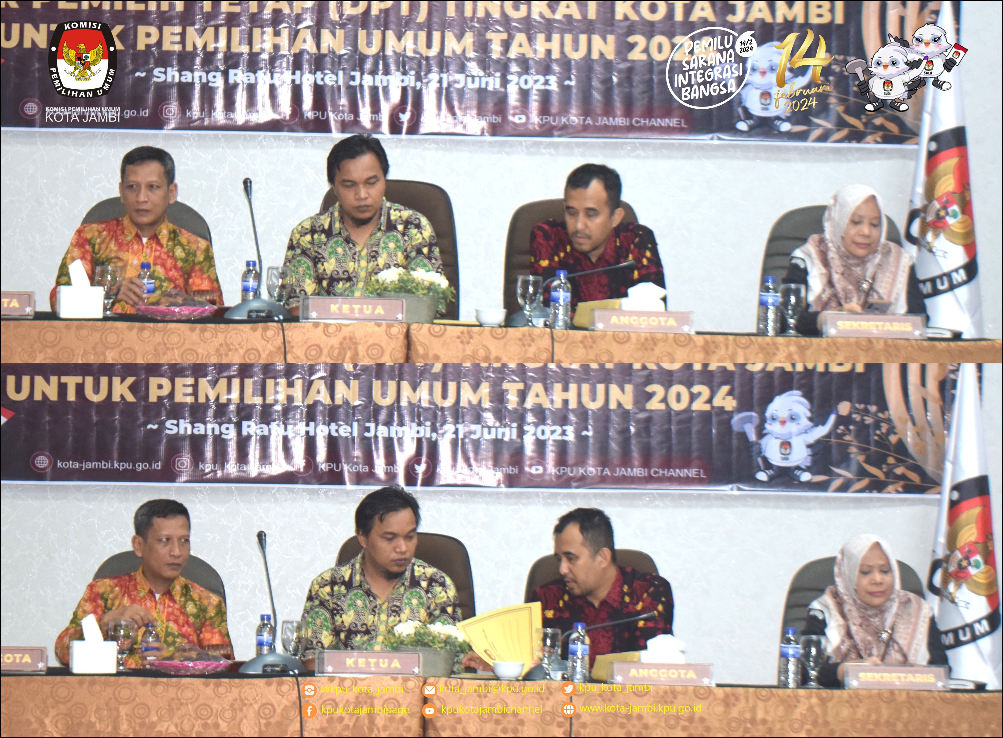 KPU Kota Jambi melaksanakan Rapat Pleno Terbuka Rekapitulasi dan Penetapan Daftar Pemilih Tetap (DPT) Tingkat Kota Jambi untuk Pemilihan Umum Tahun 2024, bertempat di Shang Ratu Hotel Jambi, Rabu (21/06/23).