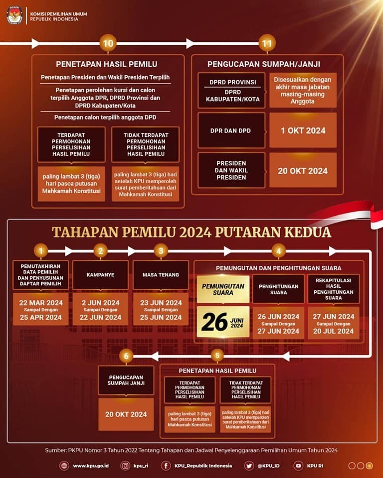 Peraturan Komisi Pemilihan Umum (PKPU) untuk penyelenggaraan Pemilu 2024 telah sah diundangkan melalui PKPU Nomor 3 Tahun 2022. Artinya, tahapan dan jadwal penyelenggaraan Pemilihan Umum 2024 sudah disepakati.