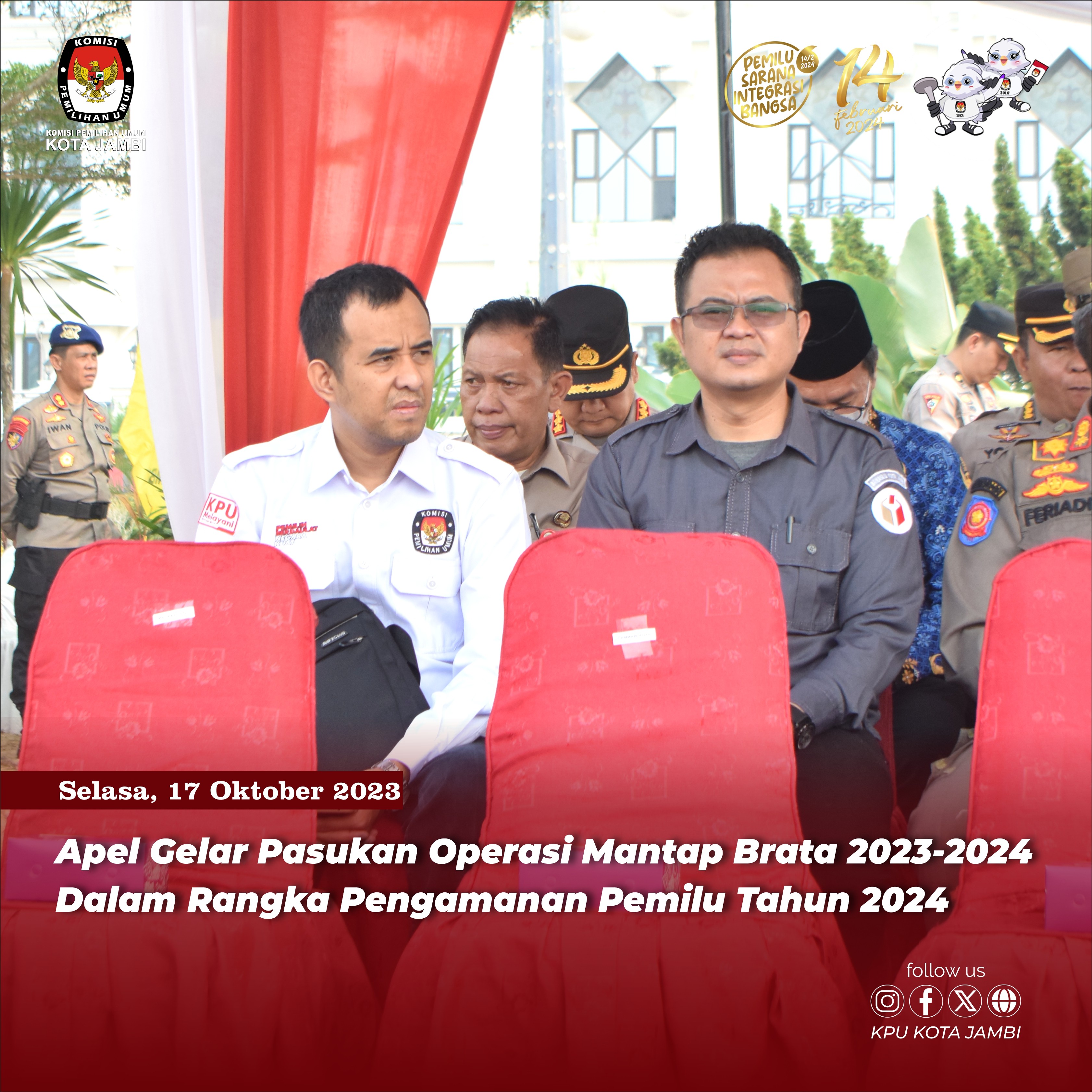 KPU Kota Jambi yang diwakili oleh Anggota KPU Kota Jambi Divisi Teknis Penyelenggara Deni Rahmat menghadiri kegiatan Apel Gelar Pasukan Operasi Mantap Brata 2023-2024, dalam rangka Pengamanan Pemilu Tahun 2024. Bertempat di Halaman Kantor Gubernur Jambi. Selasa (17/10/2023).
