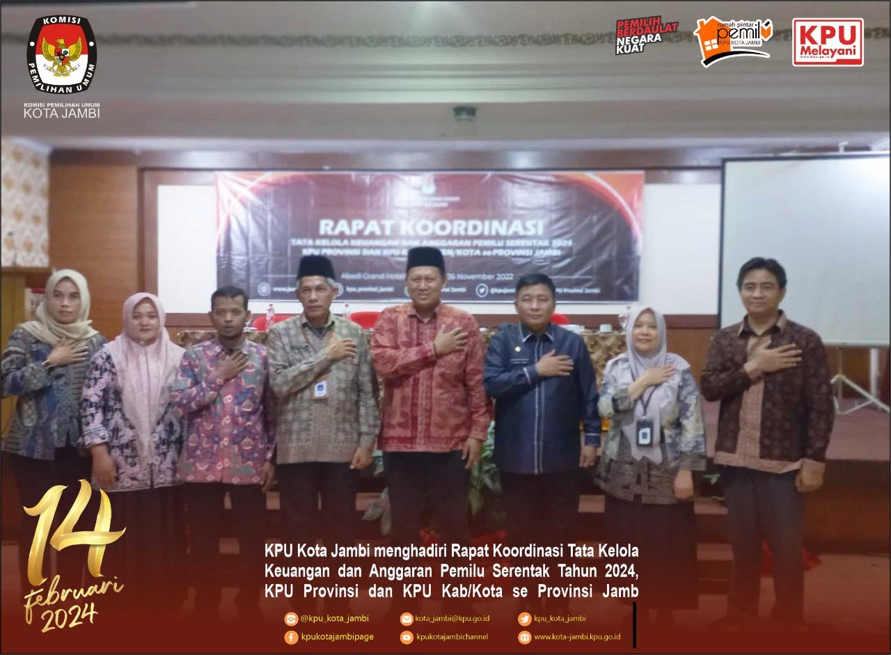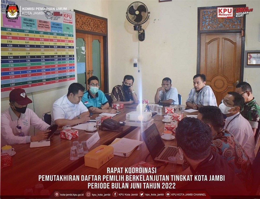 Komisi Pemilihan Umum Kota Jambi melaksanakan Rapat Koordinasi Daftar Pemilih Berkelanjutan Tingkat Kota Jambi Periode Bulan Juni Tahun 2022, Jum’at (01/07/2022). Rapat Koordinasi dilaksanakan di Ruang Rapat KPU Kota Jambi dipimpin langsung oleh Ketua KPU Kota Jambi Bapak Yatno, S.Pd.I beserta Anggota KPU Kota Jambi Bapak Arief Lesmana Yoga, S.TP dan Bapak Deni Rahmat, S.Sos, Rapat Koordinasi ini dihadiri oleh perwakilan dari Bawaslu Kota Jambi, Polresta Jambi, Kejaksaan Negeri Jambi, Kodim 0415/Jambi, Dinas Dukcapil Kota Jambi, Kemenag Kota Jambi, Lapas Kelas IIA Jambi, dan Kabag Pemerintahan Kota Jambi.