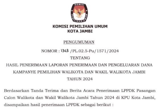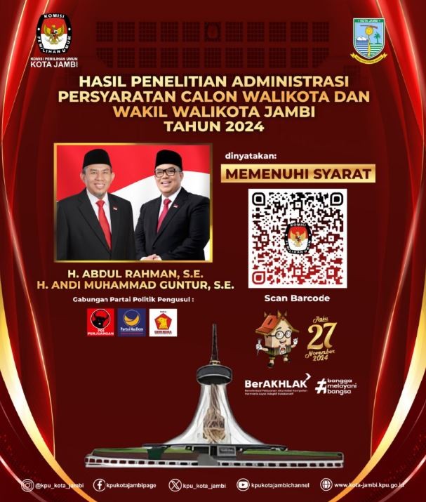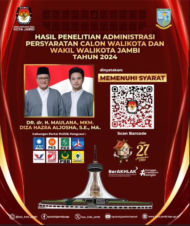 Untuk info lebih lengkap terkait Visi, Misi, dan Program Pasangan Calon Walikota dan Wakil Walikota Jambi Tahun 2024 dapat mengakses link berikut ini : https://bit.ly/Visi-Misi-ProgramPaslon2024