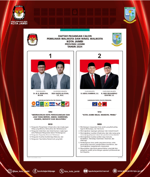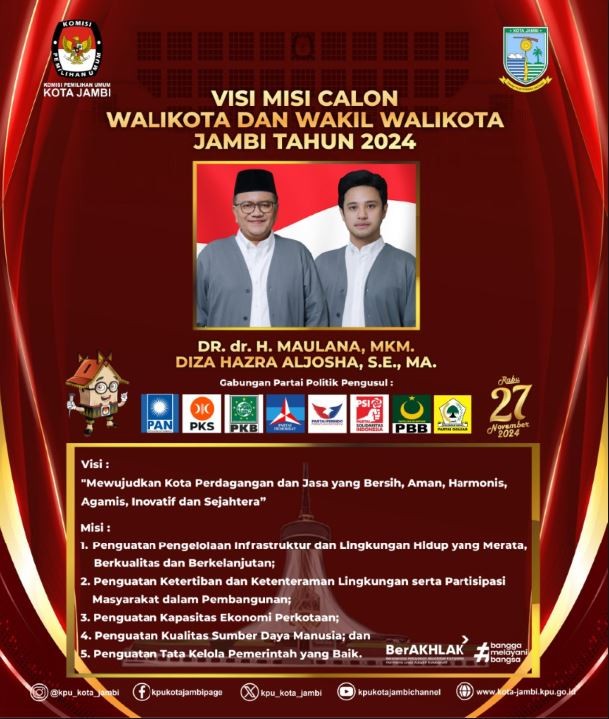 Berikut kami sampaikan Visi Misi Pasangan Calon Walikota dan Wakil Walikota Jambi Tahun 2024, Pasangan Calon DR. dr. H. Maulana, MKM. - Diza Hazra Aljosha, S.E., MA.