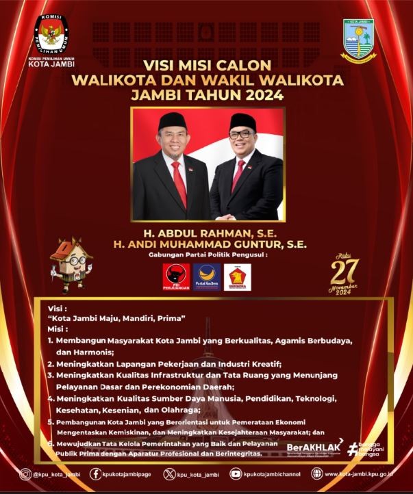 Berikut kami sampaikan Visi Misi Pasangan Calon Walikota dan Wakil Walikota Jambi Tahun 2024, Pasangan Calon H. Abdul Rahman, S.E. - H. Andi Muhammad Guntur, S.E.